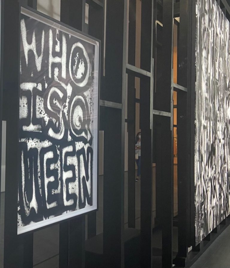 This 2023, intense exhibition at the mumok in Vienna, curated by Marianne Dobner, expands over two floors and presents an unparalleled richness to follow the many ideas that always keep playing with and against each other in Adam Pendelton’s iterations of core questions. To do so, we might endeavor into this depth by way of Hortense J. Spiller’s thoughts of certain centers of interpretation again that mark epistemological fields that cannot hold what they lay hold on. So we can find, then, along some of those centers that she suggests, and where we will certainly cross James A. Snead, some guidance. So that the centers, and the interpretation, and certainly the fields, swirl some more and totally spiral ourthoughts beyond of the pull of gravity and yet, keep us bound to the committed study of finding more counter moves.Those two critical minds, Spiller and Snead, like perhaps no other critical thinkers, diligently and thoroughly move towards a mapping of a certain convergence of densities that move outwards as escape by way of translating. Always deeper into interwoven text/tures, always in and always already somewhere much further than what seems to move across the interface of the lettering fabric. So we keep their thoughts in mind all along the many paths. Taking up the task of translating way beyond Walter Benjamin’s notions but always with a certain tone, the Benjamin tone, close by. Which, then, throws us right to where we find ourselves, in Pendleton’s Blackness, White and Light digging deep into a certain kind of spatial manifestation of all that critical stuff going on, as in intramural converging. But in outward motions, within and farther so to speak—and linger within Spiller’s Black, White and in Color, or Learning How to Paint: Toward an Intramural Protocol of Reading. Perhaps joining together two disorderly epistemological fields into an intramural ex//position. Although the title of text and exhibition seem a bit blunt set side by side, that stark resonance there is indeed a conversation that seems relevant to both. The site of an intramural ex//position. These moves are less of a settled showing and much more a forceful making. Putting all those thought-forces of Spiller’s text(s) into play with those questioning demands of Pendleton’s work, we see these words, marks, gestures and color a little denser, and in an immediate resonating sound-field that sits along and besides those two thinkers. And yes, as the titles suggest, there is color in Blackness, White and Light, lights of ultra/viole/(t)/nce. There is always more than black and white whichever way you translate those modes into the world. Without consideration of their prismatic complexities, they are so often reduced to the notion of black(ness) and white (ness) as two binary modes of ordering the social relations of our geopolitical maneuvering–and how we conduct ourselves according to it. So the suggestion of this ex//position seems to complicate the way we translate those modes into the world and to take aim at that violent production which defines black and white as the primary mode of a horribly reductive andviolent way of relating. Of seeing. Here, in the simplest terms, blackness, black and white with some color turns into light/ning, complicated by centers of pressure that are neither black nor white but energetic rays resonating—with a new rhythmic frequency— and setting off grumbling fields of clashing particles. Because the Ultralight Beam(s)9 are always there in their energetic particles. A besideness that moves into expansion always staying close to what keeps on going.